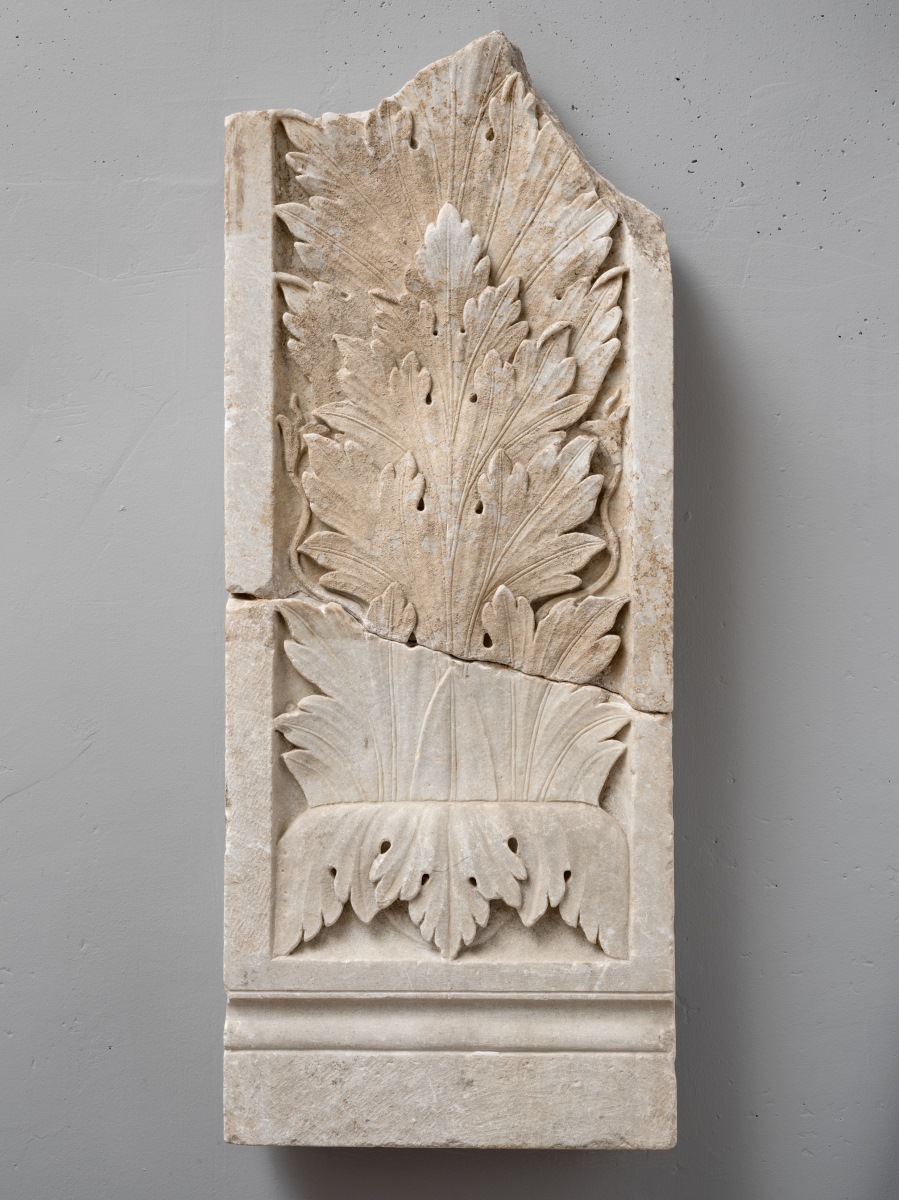 D'un grand culot d'acanthe dont la première feuille retombe vers l'avant naissent d'autres grandes feuilles nervées, aplaties et se recouvrant. [Daniel Cazes]