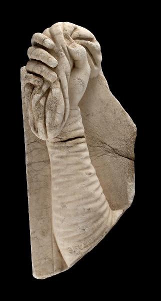 Arrière : à peu près plat latéralement, grossièrement piqueté vers l'intérieur. Bras droit enserré dans une manche qui l'enveloppe jusqu'au poignet. La main a conservé tous ses doigts qui saisissent une étoffe ramassée, torsadée et plissée où l'on peut reconnaître la mappa du cirque. L'angle formé par le bras et l'avant-bras est perceptible. D. Cazes, 2009.