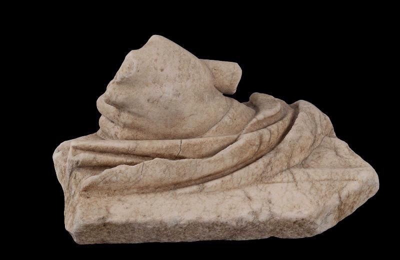 Arrière du relief piqueté grossièrement vers l'intérieur, presque plat latéralement. La main gauche surgit d'une manche qui enveloppe le bras. Pouce, index et majeur sont cassés. Les deux doigts subsistants sont fléchis vers le haut. La main tenait un bâton (sceptre, hampe). Au-dessus de la manche passe puis retombe latéralement la draperie d'un manteau. Le marbre, malade, est fissuré et sucre. Cassures franches en haut, à droite et en bas. D. Cazes, 2009.