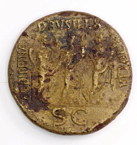 Au droit : C CAESAR AVG GERMANICVS PON M TR POT - Tête laurée de Caligula à gauche. Au revers : AGRIPPINA - DRVSILLA - IVLIA // S C - Agrippine, Drusille et Julie, les trois soeurs de Caligula, tenant chacune une corne d'abondance.