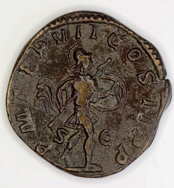 Au droit : IMP GORDIANVS PIVS FEL AVG - Buste lauré, drapé et cuirassé, vu de trois quarts arrière à droite. Au revers : P M TR P VII COS II P P S - C - Mars en habit militaire avançant à droite, tenant un bouclier rond et une lance, fer en avant. Texte : Marie-Laure Le Brazidec, 2017