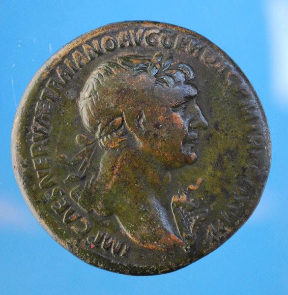 La simple coiffure « au bol » de Trajan (dynastie antonine) retranscrit bien l'ambiance virile des camps militaires, en Germanie ou en Dacie (Roumanie), où l'empereur a passé la majorité de sa vie. Cette coupe de cheveux rappelle aussi l'austérité de l'époque républicaine. Devant le buste, la cuirasse représentée est l'égide, offerte à Minerve par Jupiter. Associée au portrait depuis Alexandre le Grand, elle rappelle le lien entre le plus grand des dieux (Jupiter) et le monarque. Trajan domine donc l'univers à l'image de cette divinité majeure. Au revers : « Le Sénat et le peuple romain (S.P.Q.R.) au milieu des princes (OPTIMO PRINCIPI) ». Optimus implique un respect religieux envers le souverain. Trajan est élevé au-dessus des hommes et investi d'une fonction supra-naturelle. Texte : Pascal Capus et Marie-Laure Le Brazidec, 2016