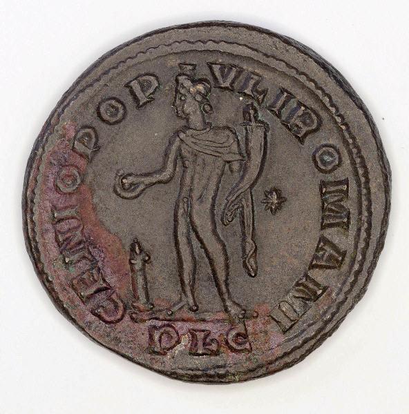 L'empereur Dioclétien est originaire de Split en Dalmatie (actuelle Croatie). Il prend le pouvoir fin 284 et s'adjoint un césar, Maximien, dès 285 afin de l'aider à gérer l'Empire. En 286, Maximien devient également empereur, Dioclétien créant alors un nouveau régime politique, la Dyarchie. Au revers, GENIO POPVLI ROMANI : « au Génie du Peuple romain ». Le type du Génie apparaît avec la réforme monétaire de Dioclétien de 294, créant une nouvelle monnaie de bronze argentée, le nummus. Le Génie tient une patère et une corne d'abondance ; il est coiffé du modius (unité de mesure romaine pour le blé) et porte un manteau sur l'épaule gauche. LG : atelier de Lyon ; P : initiale pour Prima, nom de l'officine où la monnaie a été produite, l'atelier pouvant en compter plusieurs. L'étoile dans le champ (espace libre) et l'autel allumé permettent de dater l'émission des années 304-305. L'autel est caractéristique des frappes lyonnaises. Pascal Capus et Marie-Laure Le Brazidec, 2016