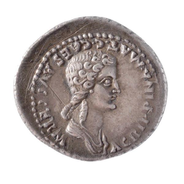 Ce denier appartient à la deuxième émission de l'atelier de Lyon. Sur ces séries, au droit, Caligula est représenté portant une couronne de lauriers, alors que dans la première émission il est tête nue. Au revers, buste d'Agrippine avec une boucle de cheveux soigneusement roulée en spirale dans le cou ; l'oreille porte une boucle de type perle et est complètement recouverte par la coiffure ; les traits du visage sont très fins. Le buste d'Agrippine l'Ancienne, mère de Caligula, de même que celui de son père, Germanicus, étaient déjà présents sur les revers de la première émission de Lyon. Caligula n'avait que sept ans lorsque Germanicus mourut. Agrippine accusa son beau-père, Tibère, d'avoir fait empoisonner son mari. Elle fut alors séparée de son fils, exilée et se laissa mourir de faim. Acquis par le musée en 2015, cet exemplaire apporte une quinzième variété de coin de revers pour les émissions de l'atelier de Lyon concernant les portraits d'Agrippine ; ce type est le second, seulement, à être conservé dans une collection publique française.