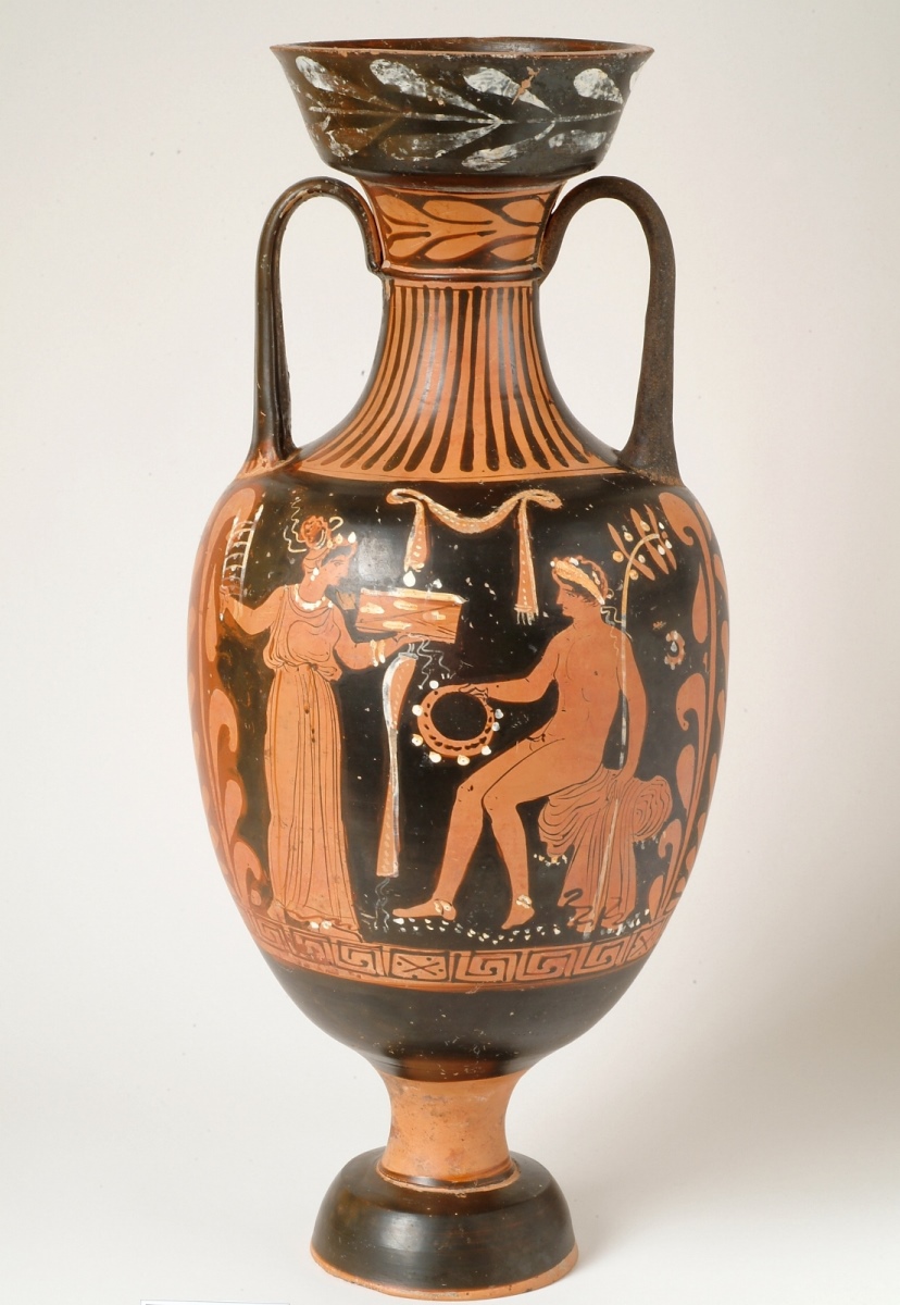 (laurier, languette, méandre, décor réticulé, palmette, rinceau, femme, chiton, bijou, diadème, xylophone, coffret, jeune homme, himation, rameau, couronne)