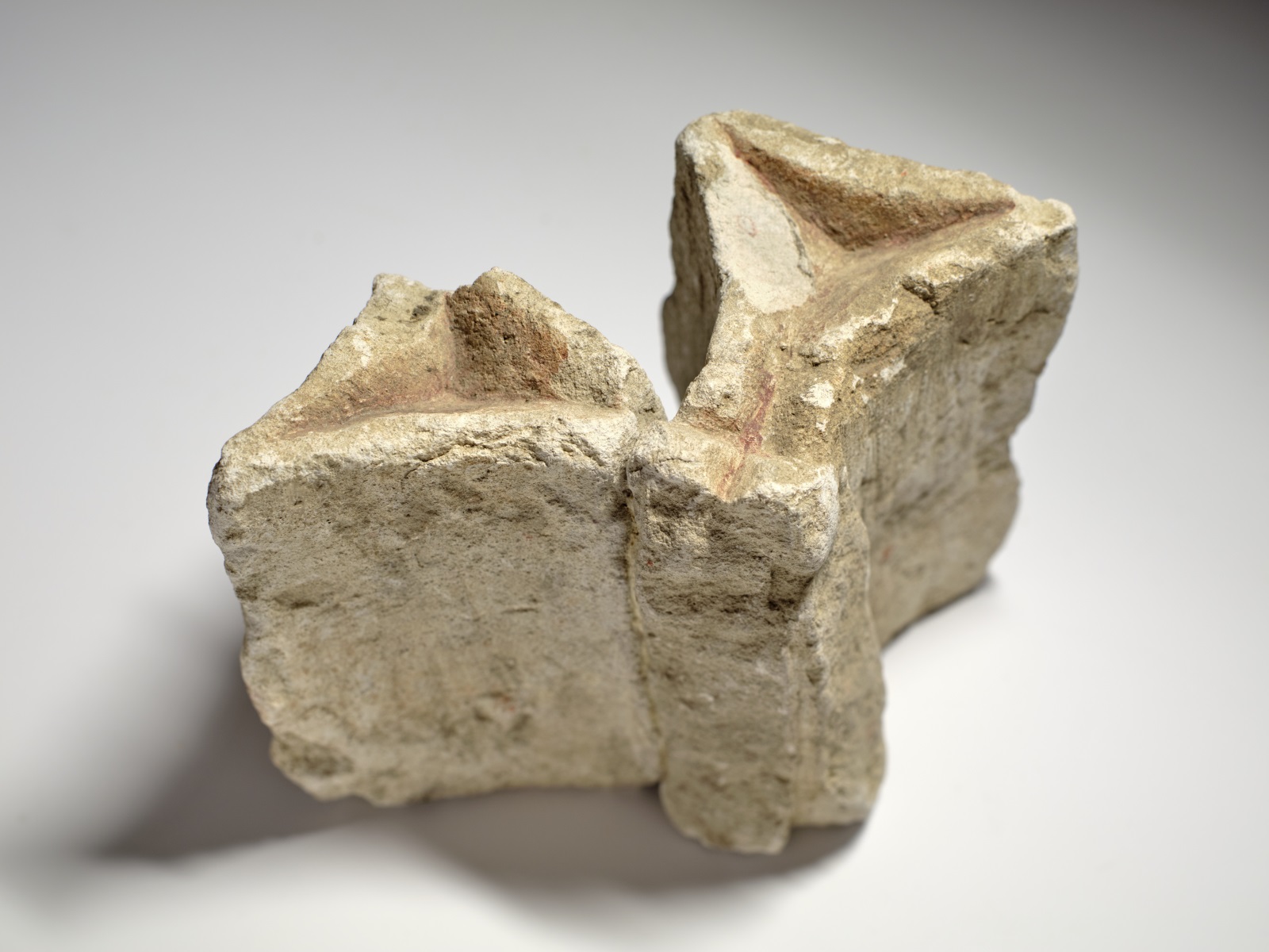 Fragment d'une croix pattée à quatre branches égales (type croix de Malte). Cet objet, peint en rouge à l'origine (traces de pigment encore visibles) devait appartenir à un élément de fermeture ajouré : chancel, fenêtre, embrasure de porte ou de fenêtre. La croix, dont le type est d'origine byzantine, était sûrement inscrite dans un cercle sur un panneau subdivisé en plusieurs médaillons à motif unique répétitif ou à motifs variés alternés. Plusieurs exemples de ce que pouvait être l'élément auquel appartenait ce décor sculpté sont visibles dans les vestiges de l'architecture hispanique d'époque wisigothique. Le chancel de Saint-Pierre-aux-Nonnains à Metz comporte un panneau de cercles dans lesquels s'inscrivent des croix. Enfin, cet objet est un des rares éléments qui puissent être associés au "grand bâtiment" de l'Antiquité tardive découvert sur le site de l'ancien hôpital Larrey.