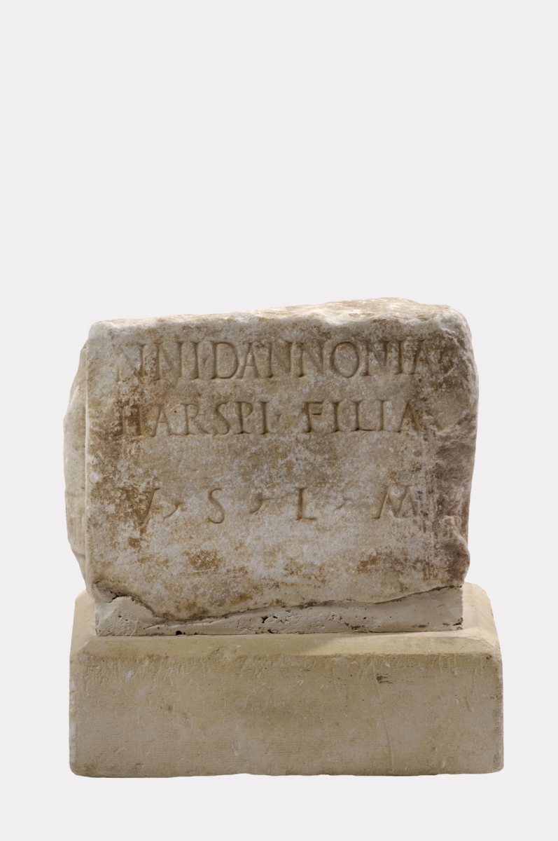 inscription (latin) : NNI.DANNONIA / HARSPI.FILIA / V.S.L.M, (Marti Lehere)nni, Dannonia Harspi filia, v(otum) s(olvit) l(ibens) m(erito), traduction : A Mars Leherenn, Dannonia fille de Harsp, a acquitté ce voeu de bon gré, comme de juste