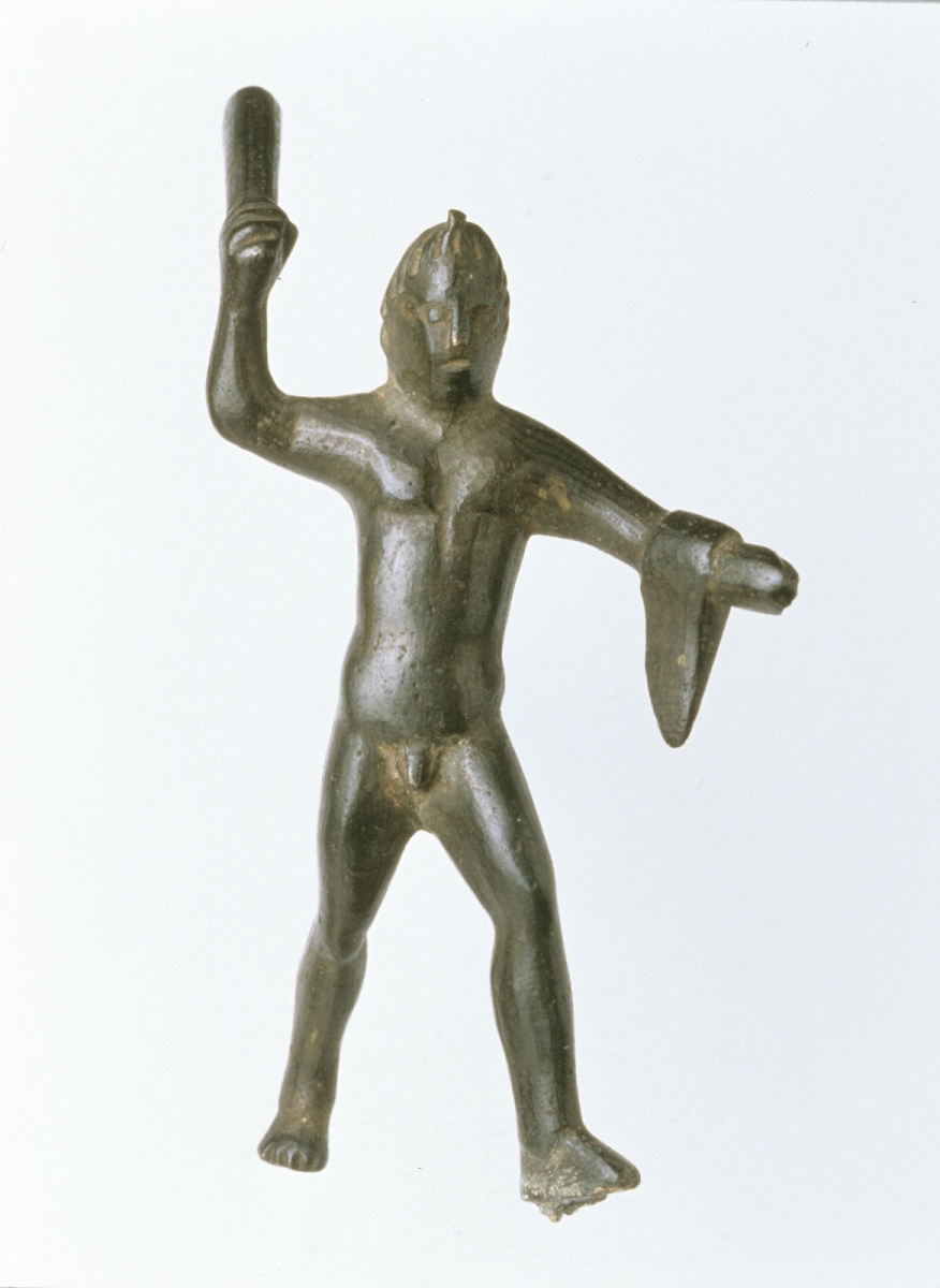 Le personnage est représenté en pleine action, la massue levée, prêt à frapper et le bras en avant. Une masse triangulaire est accrochée à son poignet : il s'agit d'une représentation sommaire de la léonté, attribut d'Herclé, l'Hercule étrusque. Evelyne Ugaglia, 1999 ; Jeune homme debout, la jambe et le bras gauches avancés, le bras droit levé en arrière tenant une massue ; le visage est traité sommairement, le nez se dégageant en léger relief entre les deux yeux et la bouche incisés; la chevelure coiffée en mèches est également représentée simplement par de traits incisés. Des lourds volumes qui composent ce corps se dégagent quelques éléments plus particulièrement marqués: le sexe, les pectoraux qui encadrent la ligne blanche, ainsi que les attributs qui permettent l'identification du héros: la massue et la léonté - représentée de manière là encore sommaire sur le bras gauche - sont en effet attribuables à Hercle, héros grec adopté par les étrusques. Cette représentation en mouvement connaitra une postérité, puisque cette posture se retrouve sur le bronze 25577 qui daterait du dernier quart du V°. Cependant un détail reste à identifier: il s'agit de la mèche qui somme la coiffure sur le dessus du crane. Jean-Baptiste JAMIN, 2012