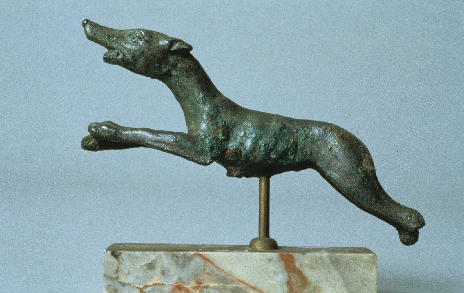 Le lévrier, courant, repose sur les pattes arrière qui sont brisées au-dessous des genoux. Il lance vers l'avant ses pattes de devant. Il a la gueule entrouverte, les machoires inférieures étant brisées. Il était soutenu par une tige dont il reste une amorce sous le ventre. Évelyne Ugaglia, notice extraite du catalogue "Les arts du métal", 1999