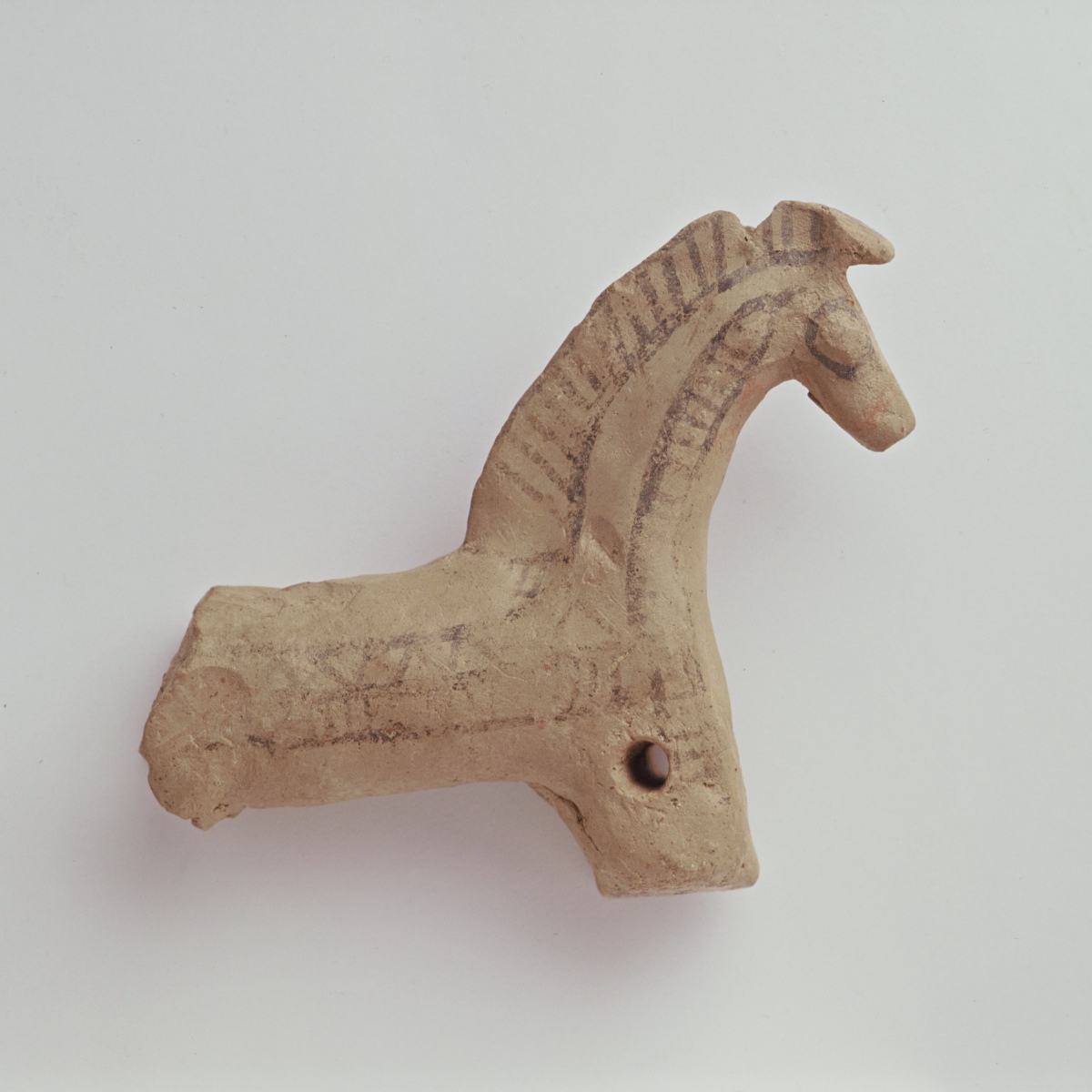 Partie antérieure d'un cheval modelé, aux détails (yeux, crinière...) peints en brun-rouge ; manquent l'arrière-train et le bas des pattes antérieures. Sur le flanc gauche, traces de l'arrachement d'un autre élément (autre cheval ?) ; un gros trou, destiné apparemment à laisser passer un essieu, confirme l'interprétation d'un modèle d'attelage monté sur roulettes. La tradition de l'époque géométrique représente des animaux schématiques et stylisés, sans réalisme. Mais à la fin de l'époque archaïque certains types de chevaux, plus réalistes, apparaissent et forment des ensembles composites, tels les quadriges attelés aux chars sur lesquels sont montés des guerriers. Dans le cas de ce fragment, où la présence d'un deuxième animal est assurée (arrachement sur le flanc) - ce qui laisse penser à un char attelé -, le trou n'est pas destiné à l'essieu du char représenté : il fait partie d'une sorte de jouet à roulette. Marguerite Yon, 2003