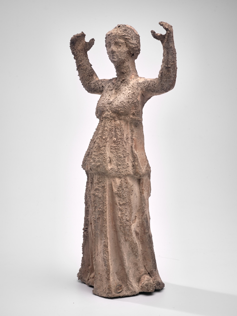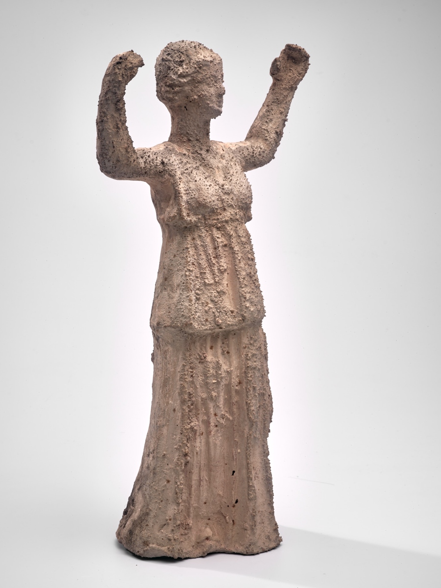 Femme les bras levés. Visage allongé, cou fin, cheveux ramenés en arrière en chignon. Robe drapée plissée, une jambe légèrement fléchie. Trou d'évent à l'arrière. Surface très rugueuse. Caroline Biro, 2002. ; Statuette de femme vêtue d'un chiton à taille haute, encolure en V avec par-dessus un autre chiton. Plis verticaux donnant l'impression de mouvement, jambe gauche légèrement fléchie et en retrait, pied gauche visible. Les bras sont levés perpendiculairement au corps, tête ovale aux traits du visage effacés, coiffée en bandeaux avec raie médiane, visage de type praxitélien.