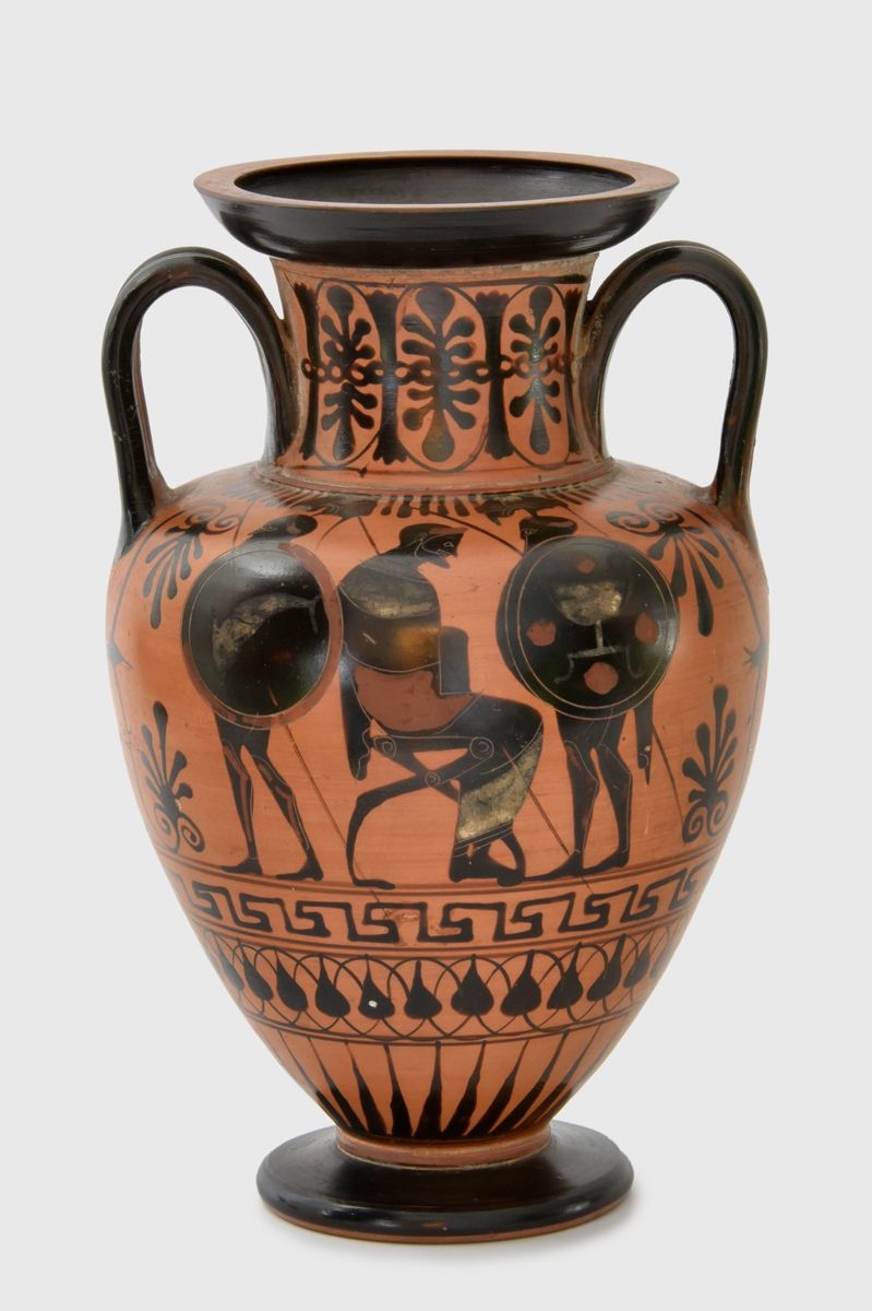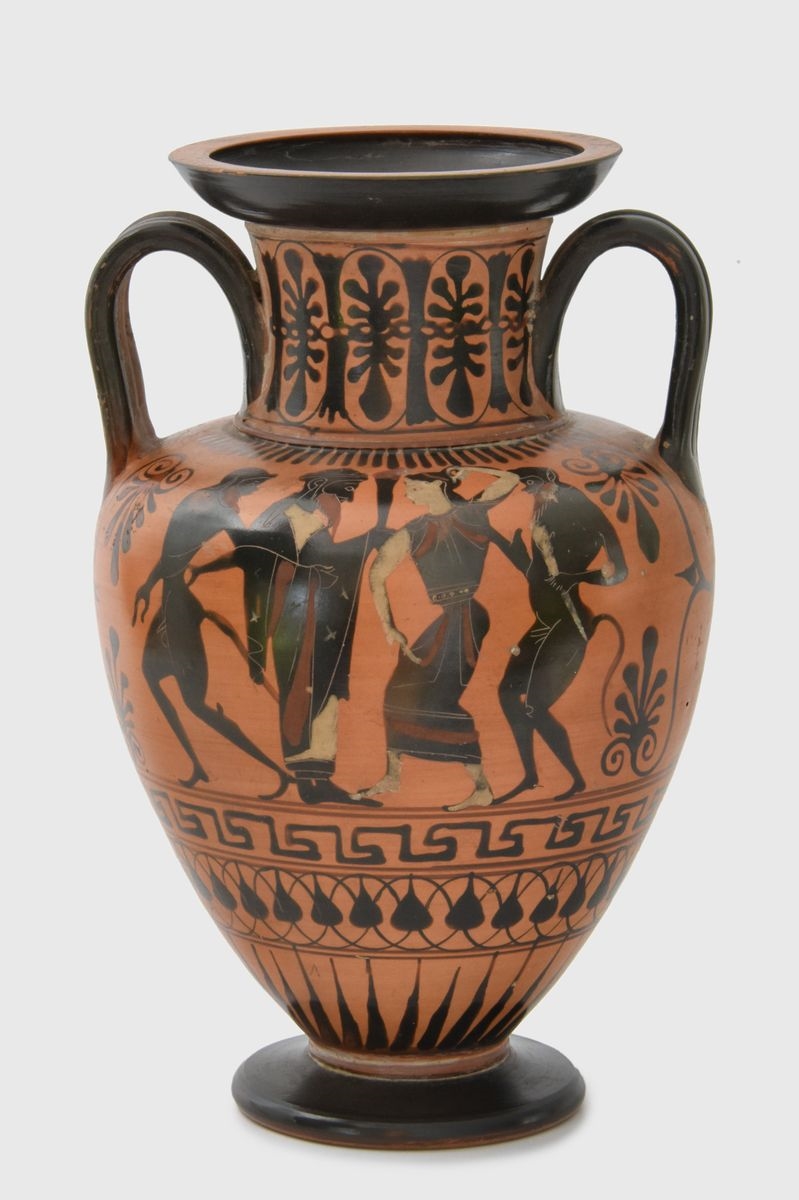 Sur le col, entre deux filets noirs, chaine de trois palmettes double, séparées de boutons de lotus stylisés. Filet rouge à la jonction du col et de l’épaule. Sur l’épaule, languettes. Sous la scène, double filet noir, méandre à gauche, double filet noir, frise de fleurs de lotus dans des arceaux, arêtes rayonnantes. Sous les anses, trois boutons de fleurs de lotus liés par quatre rinceaux, avec volutes, donnant naissance de part et d’autre de l’anse à quatre palmettes. Sur la panse : Face A : Quatre personnages vers la gauche. Au centre, Dionysos à droite, habillé du chiton et de l’himation, tenant un kéras. A gauche, un satyre vers la gauche. A droite, ménade vêtue d’un péplos et satyre tenant un kéras. Face B : A gauche, guerrier casqué, tenant une lance et un bouclier à l’épisème de dauphin, et avec des cnémides vers la gauche ; Au centre, personnage masculin barbu, vêtu d’un himation, assis sur diphros vers la droite ; A droite, guerrier casqué, avec un himation, tenant une lance et un bouclier à l’épisème de canthare flanqué de quatre points rouges) vers la gauche. Mathieu Scapin ; Amphore à col de petite taille, aux anses trifides légèrement concaves. Système décoratif : sur le col chaîne de palmettes et boutons de lotus très négligés, languettes sur l'épaule, sur le bas de la panse méandre à gauche, frise de boutons de lotus sous arceaux, arêtes rayonnantes, sous les anses grand motif végétal à palmettes et boutons cantonné d'un point. Scènes figurées : A. Scène dionysiaque. Dionysos, barbu et couronné, lève un kéras face à une ménade dansant, à gauche un satyre se contorsionne, à droite un autre satyre tient un kéras. B. Défilé de guerriers. Un homme barbu, couronné, vêtu d'un himation et tenant une lance (ou un bâton ?) est assis sur un diphros. Il est entouré de deux guerriers marchant vers la gauche ; dissimulés derrière leur grand bouclier rond, l'hoplon, ils tiennent une lance, sont coiffés d'un casque corinthien à cimiez sur hampe et portent des cnémides. Des rehauts rouges et blancs soulignent le décor des boucliers, dauphin en épisème à gauche, canthare flanqué de quatre gros points rouges pour celui de droite. Si l'on trouve des scènes de défilés de guerriers dans la céramique attique à figures noires, elles sont moins fréquentes que les scènes de combat, les scènes d'entraînement ou celles comportant des cavaliers. Les deux guerriers portent l'équipement habituel de l'hoplite ; leur cuirasse est dissimulée par leur bouclier sur lequel l'épisème est à la fois décor apotropaïque et signe de reconnaissance. La présence de l'homme plus âgé, assis, présidant au défilé, peut faire référence à une institution de la cité ; mais le lien entre l'image et la matérialité de la vie civique n'est pas aussi précis. C'est plutôt la qualité du citoyen en armes reconnu par le représentant de la cité qu'évoque la scène (voir l'amphore n° 26097). Evelyne Ugaglia ; Amphore à col de petite taille, aux anses trifides (faites de trois boudins) légèrement concaves. Le décor sur le col est composé d'une chaîne de palmettes et de boutons de lotus. La panse est décorée de méandres et d’une frise de boutons de lotus sous arceaux. Un grand motif végétal à palmettes se développe sous les anses. La scène figurée de la face A présente un Dionysos, barbu et couronné. Il lève un kéras (corne à boire) face à une ménade dansant. À gauche un satyre se contorsionne, à droite un autre satyre tient lui aussi un kéras. La face B présente un défilé de guerriers : un homme barbu, couronné, vêtu d'un himation (manteau de laine) et tenant une lance est assis sur un diphros (siège sans dossier) ; il est entouré de deux guerriers qui, dissimulés derrière leur grand bouclier rond, l'hoplon, tiennent une lance, sont coiffés d'un casque corinthien à cimier sur hampe et portent des cnémides (jambières). Des rehauts rouges et blancs soulignent le décor des boucliers (dauphin et canthare, vase à boire le vin). Si l'on trouve des scènes de défilés de guerriers dans la céramique grecque, elles sont moins fréquentes que les scènes de combat, les scènes d'entraînement ou celles comportant des cavaliers. Les deux guerriers portent l'équipement habituel de l'hoplite ; leur cuirasse est dissimulée par leur bouclier sur lequel le motif central est à la fois décor apotropaïque (à valeur protectrice) et signe de reconnaissance. Anaell Viollat, d'après la notice d’Évelyne Ugaglia extraite du catalogue d'exposition « L'art grec au musée Saint-Raymond », 1993.