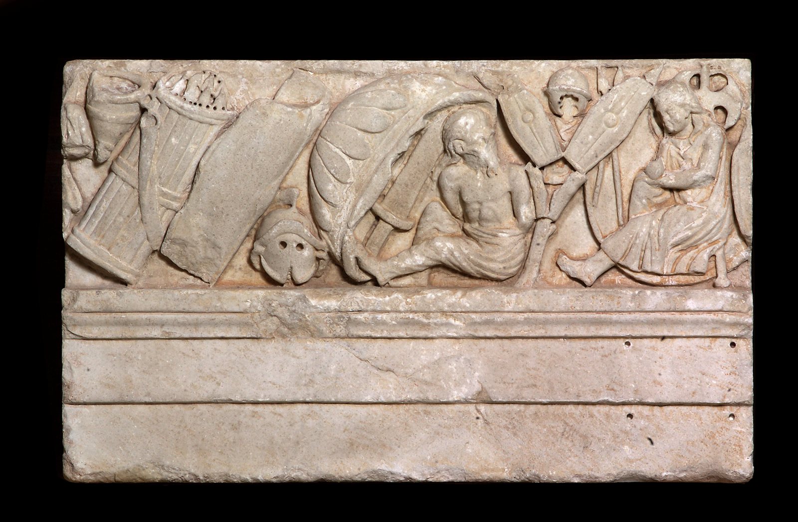 Cette section fait partie d'un ensemble, qui ne se raccorde pas mais qui provient d'un monument funéraire romain. D'autres éléments sont toujours intégrés à l'architrave de l'église Saint-Just. Ce bloc se compose des thèmes suivants, de gauche à droite : Un carquois ouvert et ses flèches ; un bouclier en tuile ; un casque de gladiateur thrace ou mirmillon ; un bouclier circulaire et convexe décoré de grands pétales ; un glaive ; deux prisonniers assis au pied d'un trophée d'armes constitué d'un tronc d'arbre sommé d'un casque, d'une tunique et auquel sont suspendus des javelots ou flèches, deux boucliers hexagonaux, deux jambières ; la femme captive, le visage appuyé sur son bras droit accoudé, se détache sur un bouclier en pelte et une double hache d'armes. Claudine Jacquet, 2016