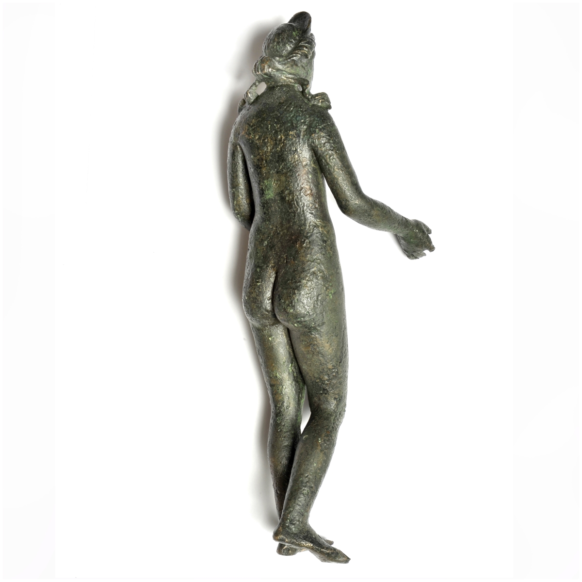 Nue, debout et de face, main droite tendue devant elle, bras fléchi, bras gauche ramené sur le ventre, main cachant le sexe. Elle s'appuie sur la jambe gauche, la droite, fléchie, pied en arrière repose sur les orteils. La tête est très légèrement inclinée et tournée vers la droite. La chevelure, partagée par une raie médiane en deux masses, se relève en rouleaux latéraux rassemblés en chignon sur la nuque d'où s'échappent deux mèches, tombant en boucles sur chaque épaule. Un haut diadème la coiffe. Le visage ovale est dissymétrique ; les yeux sont pupillés et lui donnent un regard lointain, sous des arcades sourcilières retombant sur la paupière supérieure. Le nez est fin, droit et pointu, la bouche petite et courte, les lèvres marquées. Évelyne Ugaglia, 2009