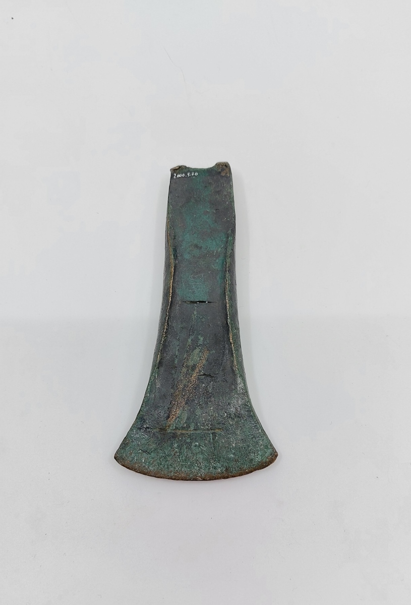 Hache à rebords et tranchant étalé. Cette pièce comporte une encoche au sommet qui révèle un caractère oriental. Le martelage a déformé le sommet. Les rebords sont peu élevés. Le resserrement des rebords a été obtenu par martelage. Les bords sont concaves. Le tranchant est convexe et étalé. Il présente des traces d'utilisation. Sophie Montès, 2005