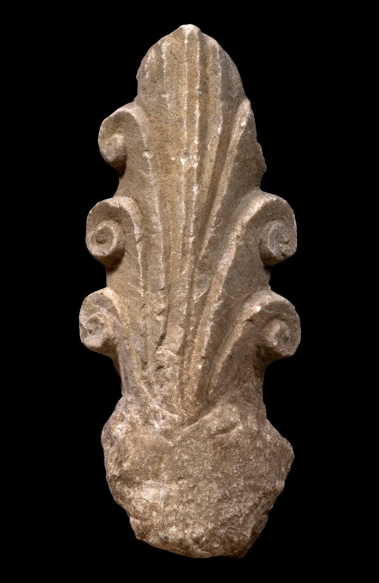 La curieuse tête aux traits simplifiés qui orne cette antéfixe est sommée d'une coiffure à frange frontale qui évoque les portraits julio-claudiens. Deux boucles en volutes s'en détachent sur les tempes. L'œuvre a peut-être été sculptée à la fin du Ier s. avant J.-C. ou au Ier s. après J.-C. Daniel Cazes, 2005