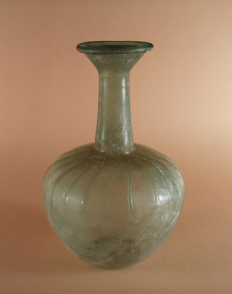 Flacon à panse sphérique en verre verdâtre. Embouchure évasée, lèvre ourlée vers l'intérieur. La panse est décorée de dépressions verticales. Fond plat. Réf. typologiques : - Morin-Jean : 39 - Isings : 101 Embouchure en entonnoir à lèvre repliée vers l'intérieur. Col cylindrique s'évasant légèrement vers le bas. Panse sphérique. Fond concave. Vingt et une fines côtes étirées de la base du col au milieu de la panse. Marie-Dominique Nenna, Périple méditerranéen, 2003.