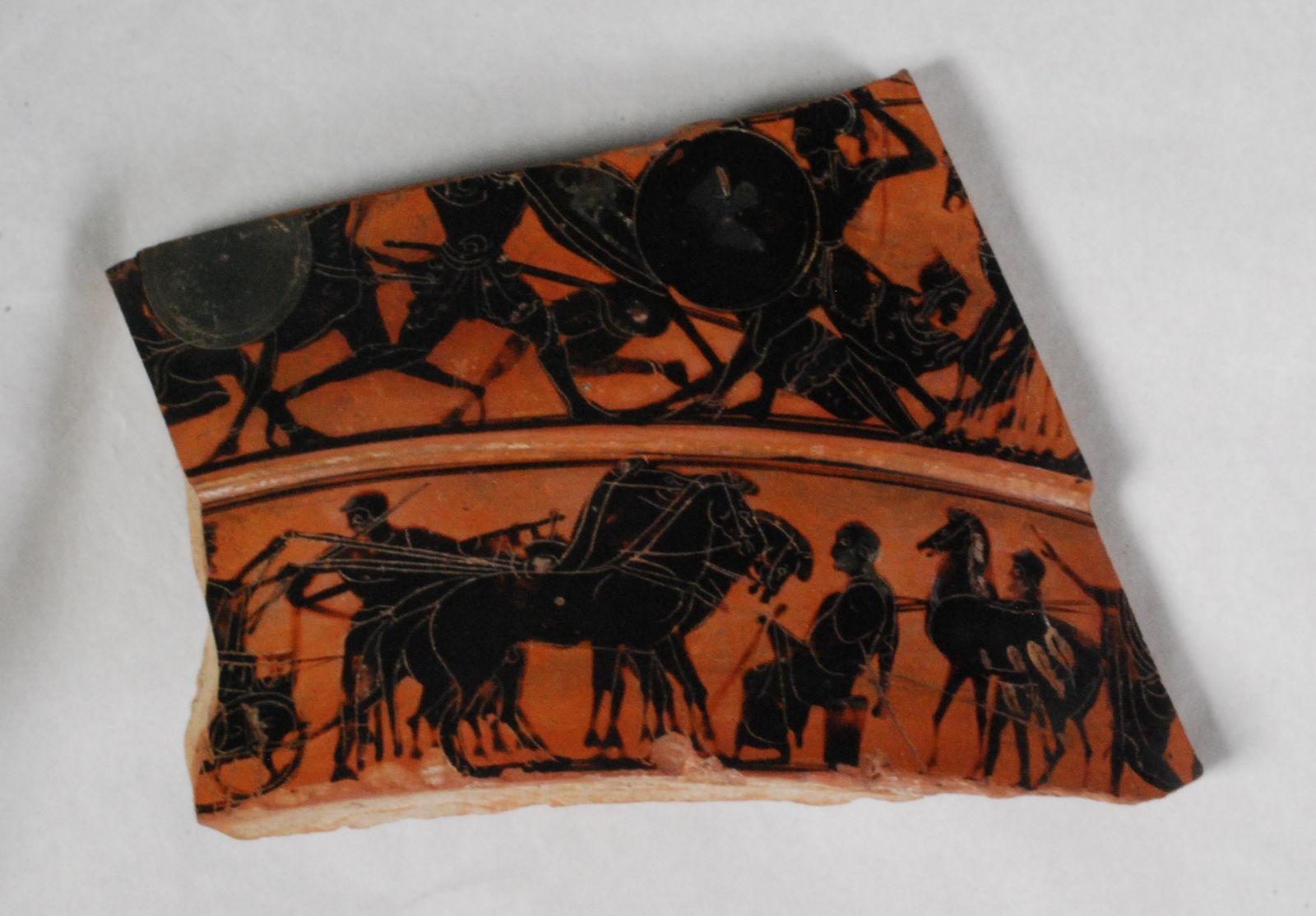 Filet noir sous la scène figurée du registre supérieur ; filet noir sur la partie supérieure du registre inférieur manquant. Registre supérieur : scène de combat. Guerriers debouts, agenouillés ou couchés, portant l'hoplon, la lance, un casque et un chitoniskos. A droite, jambes de chevaux, et tête de chevaux. Registre inférieur : Quadrige et son aurige, face à un vieil homme assis, tenant un bâton et drapé dans un himation ; derrière les chevaux, homme tenant un bâton. A droite, garçon et cheval vers la gauche et corps d'un homme drapé vers la gauche. Mathieu Scapin