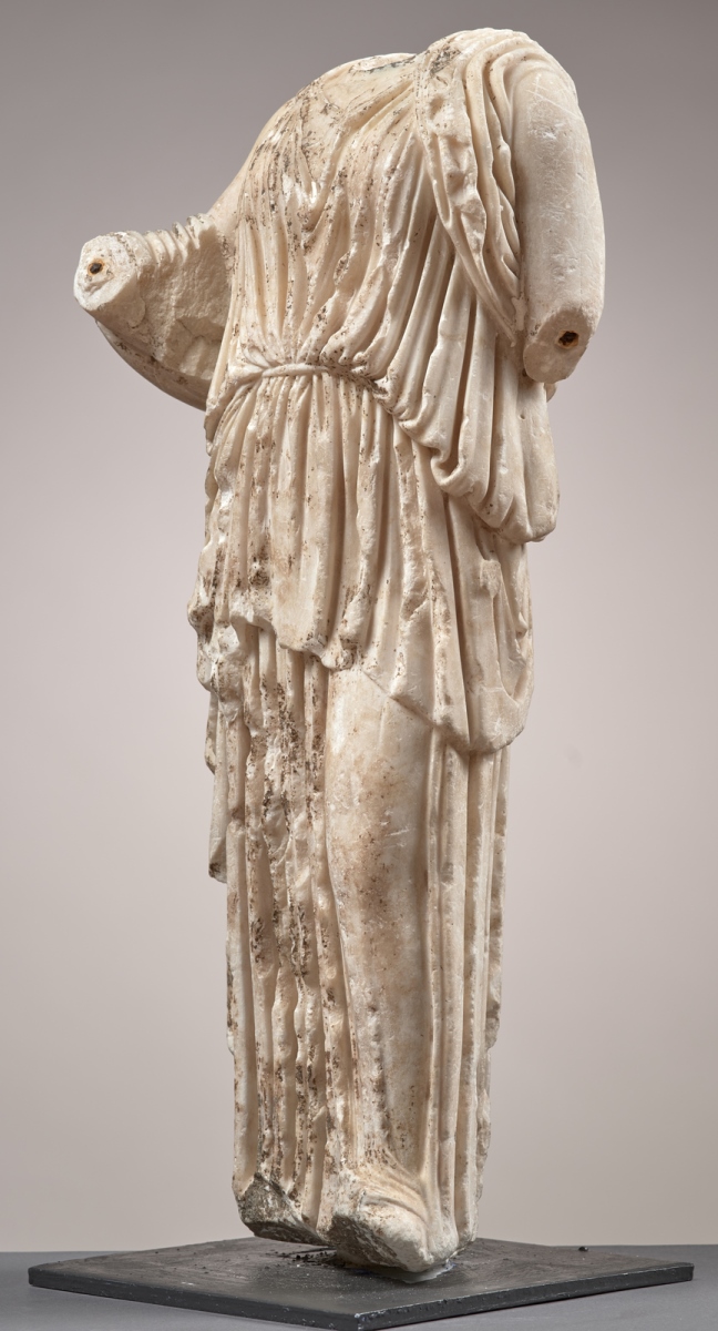 Cette figure féminine, que l’on peut dater du IIe siècle, est une œuvre romaine qui reprend les caractéristiques d’ une création grecque, plus précisément attique, malheureusement disparue, de la seconde moitié du Ve siècle avant J.-C. Parmi les exemplaires conservés de ce type statuaire, le plus célèbre est une statue, haute de 2,86 mètres, sur une plinthe de 30 cm, reconnue comme une représentation de la déesse Artémis. Découverte à Ariccia (Latium), elle est conservée à Rome, au Palazzo Massimo alle Terme. Seule Brunilde Sismondo Ridgway émit l’hypothèse que l’Artémis d’Ariccia ne dépendrait pas d’une création grecque mais caractériserait plutôt le courant artistique classicisant, privilégié par des ateliers implantés à Rome. Ces derniers, on le sait, tout en s’inspirant de la plastique hellénique, furent effectivement à l’origine d’une série d’œuvres qui suivaient, en matière d’esthétique, des courants à caractère rétrospectif. C’est cependant vers les années 440 avant J.-C. que les chercheurs se sont très majoritairement tournés afin de comprendre la source de la grande effigie exposée à Rome. Une source que partage par conséquent l’exemplaire toulousain. L’œuvre mise au jour à Ariccia en 1919 et fut associée à Artémis en raison du lieu de sa découverte, non loin du grand complexe religieux dédié à la déesse latine Diane, dite Aricine (Aricina), équivalente dans ses fonctions à la déesse grecque, sœur jumelle d’Apollon. Mais c’est d’une très riche villa que provient la sculpture, et non du sanctuaire. L’œuvre qui proviendrait d’Auch et qui appartint à la famille d’Ayrens, selon Alexandre Du Mège, fut donc mise au jour bien avant la monumentale statue du Latium. Il ne faut donc pas s’étonner si conservateurs successifs du musée de Toulouse et savants ne la relièrent pas au type statuaire revenu dans les Monts Albains. La statuette est acéphale. De la chevelure demeure le long chignon tressé retombant dans le dos. La déesse se tient droite et seule la jambe gauche est légèrement avancée. Le vêtement grec est constitué d’un péplos, ouvert le long du côté droit, ceinturé à la taille, formant un large pli latéral et maintenu, sur les épaules, par des fibules. De ces deux accessoires vestimentaires, permettant la fermeture du vêtement, seul celui situé à droite est visible, l’épaule gauche étant couverte d’un manteau. Celui-ci est enroulé et ramené transversalement dans le dos et maintenu par le bras droit, replié, dont l’avant-bras, disparu, était originellement fixé par un tenon. Du bras droit, disposé le long du corps, ne reste que la partie supérieure, le reste d’un tenon, au-dessus du coude, témoignant encore une fois d’un avant-bras originellement rapporté. À l’exemple de la statue colossale mise au jour à Ariccia, les jambes, qui se devinent sous le péplos, sont trop courtes par rapport au buste. Cette disproportion a été expliquée par l’éventuel mode d’exposition de la statue grecque originale, certainement en bronze, installée « sur un socle élevé, dans une abside au fond d’une salle à caractère vraisemblablement cultuel, où la divinité pouvait émerger de la pénombre et dominer l’espace dans toute sa puissance expressive, uniquement visible de face » (De Lachenal 1979, p. 162). Destinée à un contexte indubitablement très différent, ne nécessitant pas le même genre de théâtralisation, la grande « Artémis » d’Ariccia, comme l’œuvre du musée Saint-Raymond, avaient été adaptées à une destination non plus cultuelle mais simplement décorative. L’exemplaire du musée Saint-Raymond, par son format considérablement réduit, était sans aucun doute parfaitement adapté à une niche aménagée dans l’une des pièces de réception d’une riche demeure auscitaine. La statuette reprend du modèle grec la rigidité verticale des plis inférieurs du péplos qui s’opposent franchement au jeu du tissu bouffant de part et d’autre de la ceinture comme aux rabats de la partie inférieure du vêtement, formant une série de sinuosité complexes. La sécheresse de la statue découverte à Ariccia, inhérente à sa monumentalité, apparaît ici largement estompée. Malgré les épaufrures nombreuses et les différentes altérations, l’exemplaire toulousain fait en effet preuve d’un plus grand naturel, d’une sensibilité soutenue par l’atténuation de la raideur générale ressentie face à son parallèle romain et l’impression d’une souplesse du vêtement, certainement facilitée par son format auquel s’adjoint la teinte ocre et chaleureuse du marbre. Pascal Capus