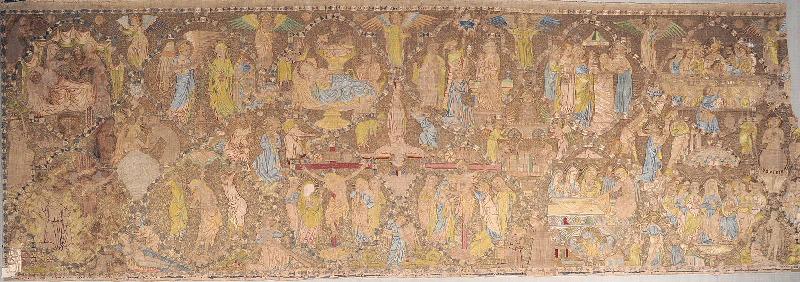 Toile de lin, broderie de soie polychromes ; Deux rangs de médaillons polylobés à redents laissent entre eux des médaillons curvilignes intermédiaires et des médaillons tronqués sur les bords. Tous ces espaces contiennent des représentations de scènes de la vie de la Vierge, de la vie du Christ, de la vie de saint François d'Assise, des représentations de saints et des anges. La broderie est faite de fils de soie polychromes travaillés au point fendu. Le fond est en fils d'or travaillés au point couché en surface. Le parement d'autel est grossièrement découpé sur la droite. Il manque sûrement quatre médaillons.