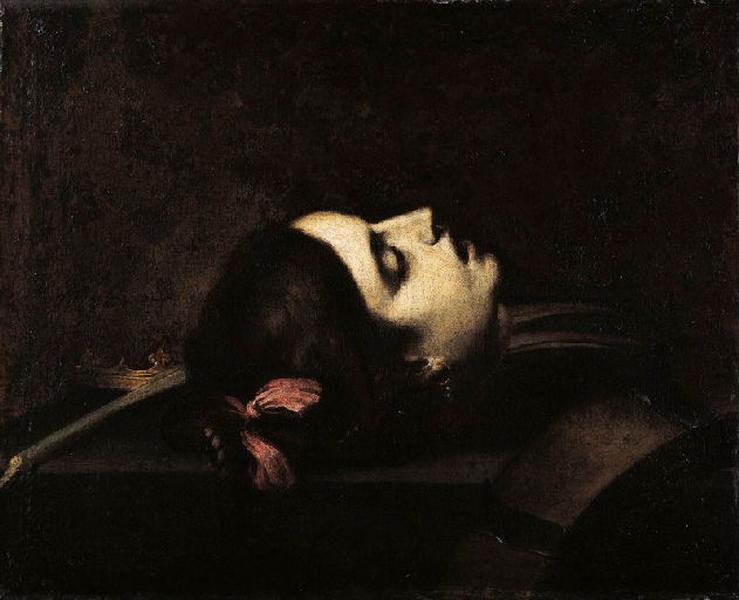 Martyre de Sainte Catherine : La tête de la princesse d'Alexandrie (on distingue sa couronne et la palme du martyre) repose sur une table à côté de la roue à crochets, instrument de son premier supplice. L'horreur funèbre le dispute à l'image charmante de la vie subitement interrompue : la magnifique chevelure de la jeune femme a conservé un noeud rose, seule note colorée de la composition. JLA (Cat. BBVA)