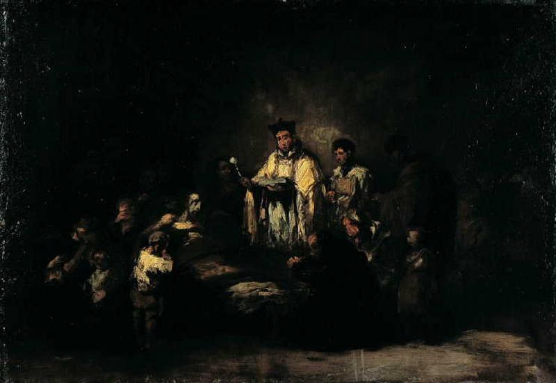 Peinte vers 1855-1856, durant une période trouble et agitée pour l'Espagne, cette oeuvre témoigne d'un genre d'inspiration populaire et dramatique. Lorsque Lucas peint cette toile il est depuis 1851 Peintre de la Chambre du Roi, et chevalier de l'ordre de Charles III. En 1855, il participa à l'Exposition universelle de Paris. L'artiste, grand admirateur de Francisco Goya et de Diego Velázquez, fut un acteur important de la période romantique. Il est un des rares artistes espagnols à approcher l'intensité expressive du monde de Goya. Le tableau qui nous intéresse représente le sacrement de l'extrême-onction administré, semble-t-il, dans la chambre d'un mourant. Le prêtre est debout, le goupillon et le missel en mains, le moribond se soulève légèrement sur son grabat en caressant un enfant en pleurs. Une foule d'hommes et de femmes s'inclinent devant le geste sacré ; le tout forme un groupe recueilli dans le chagrin et la méditation. L'harmonie et la sobriété des tons de jaunes, de rouges, de bruns contribuent à créer une atmosphère intime de profonde tristesse. La lumière dirigée essentiellement sur le prêtre qui semble dans un halo lumineux, fixe le point central de la composition du tableau. Ce qui caractérise Eugenio Lucas c'est encore sa touche, épaisse, nerveuse, les empâtements de peinture sont nettement visibles, les traits sont à peine esquissés sans détails, mais le résultat est là : un tableau émouvant d'une rare intensité expressive. Deux autres compositions similaires nous sont connues (Arnaiz, 1981, p. 409) : Le Viatique du pauvre (Städelsches Kunstinstitut de Francfort, signé et daté de 1855) et La Dernière heure, collection Lazaro, en dépôt à l'Ambassade d'Espagne à Washington. Extrait du cat. exp. Madrid / Bilbao, 2002/2003, C. Berthoumieu