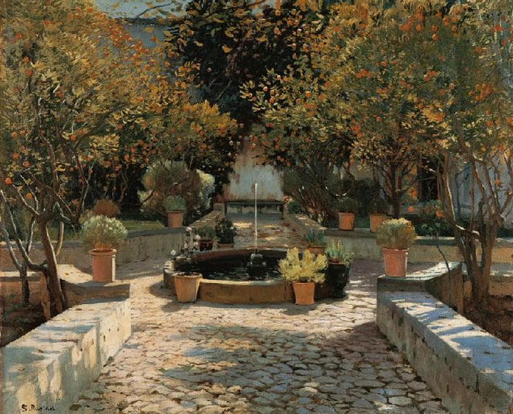 Dans le genre du paysage, Santiago Rusiñol y Prats reste à coup sûr le plus sensible et le plus poète des artistes du 19e siècle en raison peut-être de ses talents d'homme de lettres. Il rencontre en 1865, lors de ses séjours à Paris, Ramón Casas, Ignacio Zuloaga et Erik Satie. Dans les dix dernières années du siècle il fait partie du mouvement moderniste en Catalogne et participe au groupe d'Els Quatre Gats, parmi ceux qui ont redécouvert Le Greco avec ferveur. Pendant des années le thème des jardins d'Espagne inspire l'artiste. La composition est presque toujours la même, mais sa palette évolue, les couleurs deviennent plus vives ; le vert, le rose et le rouge vermillon atteignent une grande intensité lumineuse. On a pu qualifier son style d'Impressionnisme méditerranéen. La cour des orangers nous montre un patio à Grenade. L'ombre claire, les tonalités chaudes des fruits, la symétrie de la composition évoquent à la fois le calme, l'équilibre et la paix dans une ombre douce [...] Rusiñol nous plonge dans une atmosphère poétique qui lui est propre et que l'on retrouve dans la majorité de ses oeuvres à partir des années 1890. Extrait du cat. exp. Madrid/Bilbao, 2002/2003, R. Tailhades