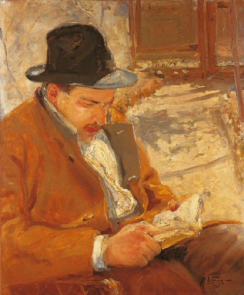 portrait (Zuloaga Ignacio, peintre, homme, assis, de trois-quarts, chapeau, habit, moustache, lecture, livre) ; effet de soleil ; cour