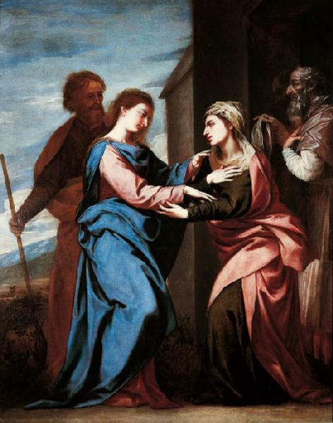 Scène à quatre personnages en arrière plan dans l'ombre, deux hommes : à droite Joseph tenant un bâton, à gauche Zacharie tenant un tissu dans sa main droite. Au centre du tableau les deux femmes, Marie drapée d'un manteau bleu sur une robe rouge, tend le bras vers Elisabeth drapé dans un manteau rouge sur une robe marron, ses cheveux sont recouverts d'un voile. Elle semble s'agenouiller devant Marie, sa main droite sur sa poitrine, son bras gauche effleure sa cousine. A l'arrière plan un paysage de collines se dessine, sur la droite l'architecture de la maison d'Elisabeth se devine.