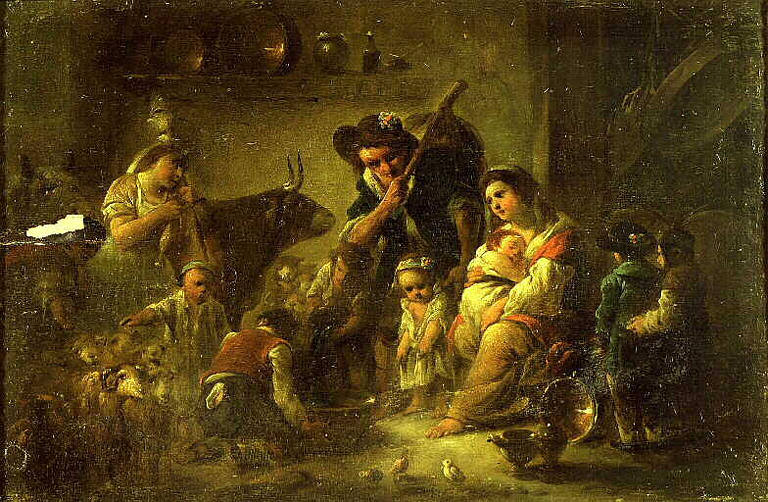 vue d'intérieur (famille, paysan, homme, femme, enfant, mouton, vache, quenouille, vaisselle)