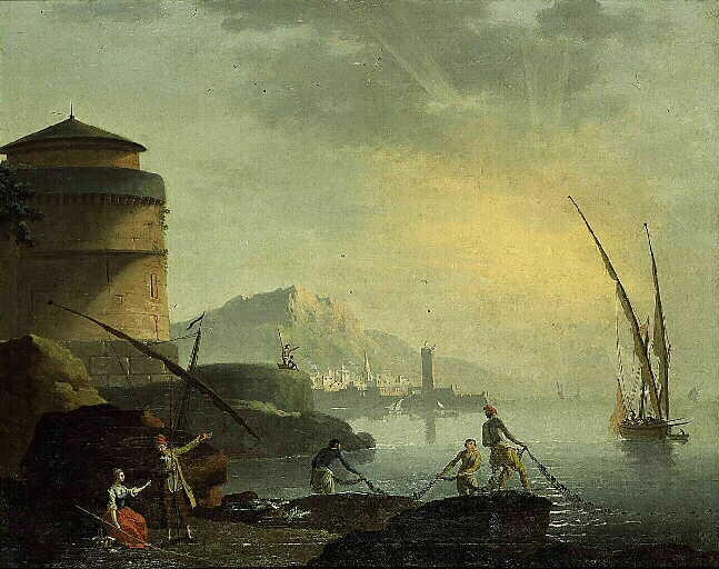 paysage (mer, pêche aux engins, filet, tour, bateau à voiles, montagne, ville)