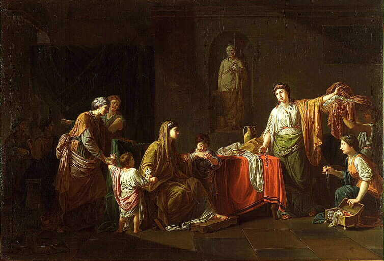 scène (moralisant, antiquité : Romain, famille, Cornélie, visite, femme, salle, statue) ; Cornélie (présentation, garçon) ; femme (présentation, tissu, bijou)