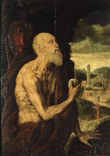 figure biblique (saint Jérôme, nudité, prière) ; fond de paysage