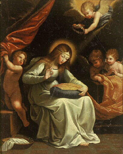 Guido Reni a peint deux versions de ce sujet. Dans l'une, la Vierge entourée de trois anges est vêtue de rouge ; dans l'autre, appelée familièrement la Couseuse, la Vierge porte une robe blanche et est entourée de quatre anges. Ces deux versions ont aujourd'hui disparu et ne sont plus connues que par des textes, gravures ou copies. L'exemplaire de Montauban, avec ses quatre anges, se rapporte à la seconde version. Inconnu de S. Pepper, il n'est pas mentionné dans sa liste des copies de la Couseuse