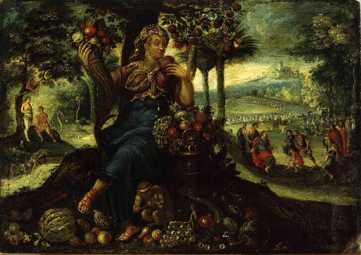 figure ; portrait (Henri III, allégorie : goût, fruit) ; scène biblique (Paradis terrestre, Adam, Eve) ; scène biblique (Multiplication des pains)