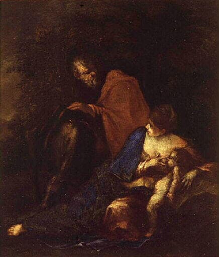 scène biblique (Fuite en Egypte, Vierge, Enfant Jésus, Joseph)