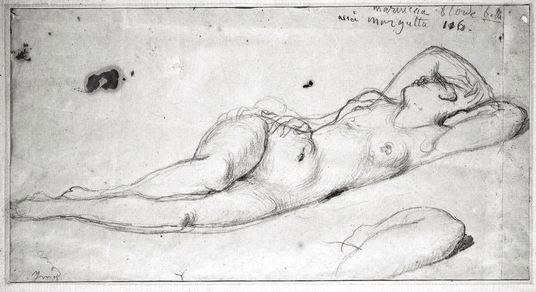 Il s'agit d'une étude pour deux tableaux de J.A.D. Ingres, sur le même thème, intitulés 'Odalisque à l'esclave'. Ingres peignit deux tableaux sur ce thème, le premier à Rome pour son ami Marcotte d'Argenteuil en 1839, le second en 1842 pour Guillaume Ier de Würtemberg. Le personnage principal, dérivé de la 'Dormeuse de Naples', est accompagné d'une musicienne et d'un eunuque. Les deux versions ne se distinguent que par la présence d'un paysage dû à Paul Flandrin dans la seconde. Le tableau de 1839 est aujourd'hui au Fogg Art Museum de Cambridge, et sa réplique, entrée en 1925 dans la collection Walters, est maintenant au musée de Baltimore. Les différences iconographiques entre les deux tableaux sont vraiment trop minimes ; en rapport avec : Ingres, l'Odalisque à l'esclave (Cambridge), Ingres, l'Odalisque à l'esclave (Baltimore)