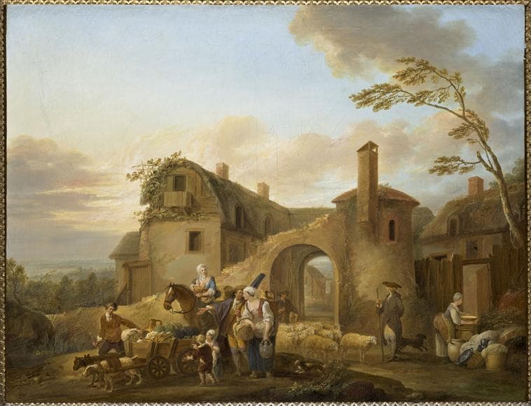 peint pour l'Abbé de Crespin, dom Aybert Spildooren;cet ensemble daté 1774 et non 1771 comme on l'a longtemps écrit suite à une erreur de lecture, a été exécuté pour l'abbé de Crespin, Ces quatre tableaux figurent parmi les oeuvres les plus célèbres de l'artiste et peuvent, à juste titre, être considérées comme des chefs d'oeuvre. Le thème des Heures du jour ou mieux les scènes de la vie à la campagne (pastorales et bergeries) et les pratiques quotidiennes des paysans sont très prisées au XVIlle siècle, tant dans le domaine pictural avec Boucher (Pastorale, Valenciennes, Musée des Beaux-Arts) ou Jeaurat que dans celui de l'estampe. François Watteau a sans doute connu la série des Quatre Heures du Jour gravées en 1770-1771 par Charles-Michel Campion d'après les dessins d'Aignan-Thomas Desfriches. Ces planches sont dédiées à Madame Brion de Jouy (B.M.V. J / 2 / 17). Ce recueil factice contient une autre série de gravures, anonymes cette fois, sur le même thème. Si la première reflète l'esprit des graveurs amateurs de cette époque, il en va différemment Pour les planches anonymes (qui semblent postérieures);le format, en hauteur, est plus grand;de plus, ces estampes, comme les toiles de Watteau, veulent refléter avec exactitude l'activité des paysans et possèdent un contenu sociologique très marqué. Ces deux séries de gravures se terminent par le motif de la Nuit que Watteau remplace par les Vespres ou l'Orage. Ce détail est fondamental pour l'approche de ces toiles. Il y a une sorte de gradation entre le Matin où chacun quitte la ferme d'un air insouciant pour mener le troupeau au pré ou vendre les produits du potager;cette joie de vivre se prolonge à Midi;le berger et la bergère s'endorment l'un contre l'autre, mais lorsque le Soir arrive, le gardien du troupeau rentre à la ferme avec un air grave. Son troupeau le précède, et - allusion à la Parabole du Bon Pasteur-, il porte une brebis dans ses bras. Le peintre a pris soin de les situer à l'extrémité de sa composition. Les Vespres ou l'Orage sont un rappel à la réalité : la nature sublime, le bonheur à la Rousseau, la confiance en l'humanité et au progrès par la Raison peuvent être remis en cause par les éléments naturels. A l'utopie néoclassique, succède une vision déjà préromantique avec les arbres courbés par le vent, le ciel chargé de nuages noirs : il faut vite rentrer les récoltes et le jeune couple comprend enfin qu'il doit désormais prendre en main son destin. J.K