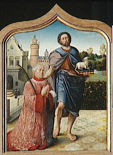 scène (homme, en pied, saint Jean-Baptiste, livre, agneau, homme, agenouillé, chanoine, palme, tour, homme, couché sur le dos, phylactère, signe alphabétique)