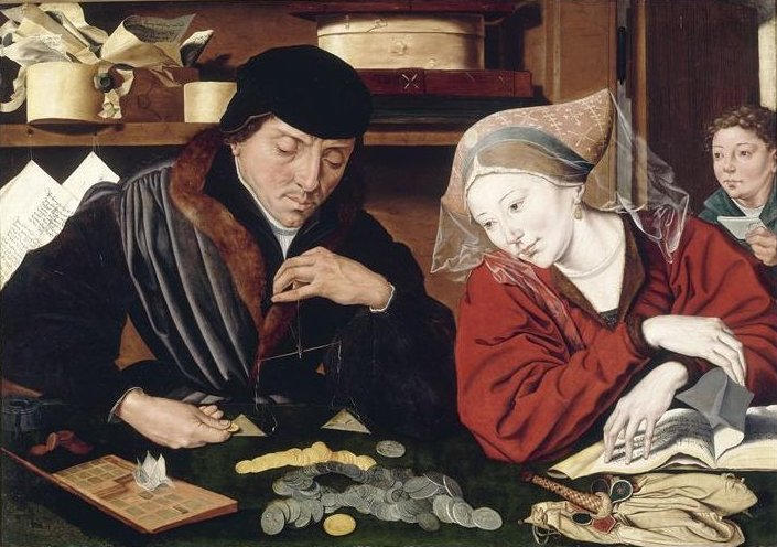 scène (homme, assis, table, banquier, balance, monnaie, or, papier, feuillet, femme, coiffe, livre)