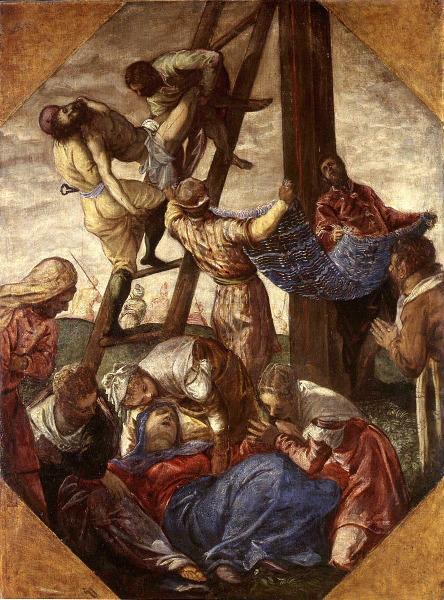 La scène représentée a été relatée par les quatre évangélistes et a souvent inspiré Tintoret. Presque toutes les versions illustrent le moment où le corps du Christ, descendu de la croix, repose sur les genoux de la Vierge ou est transporté vers le tombeau. Seules les oeuvres de Strasbourg et de Caen ont saisi l'instant où le corps est descendu par deux hommes au moyen d'une échelle appuyée à la croix, auprès de laquelle Joseph d'Arimathie et Nicomède attendent en tenant un somptueux linceul. La composition de Caen est coupée en deux par la ligne d'horizon sur laquelle se profilent quelques soldats qui s'éloignent. Les hommes de la partie supérieure se détachent sur le ciel clair d'une fin de journée; dans la partie inférieure, la Vierge évanouie et les saintes femmes ne se distinguent du sol que grâce à la lumière vespérale venue de gauche. Cette opposition entre la clarté du ciel en haut et la terre sombre en bas accentue l'intensité poignante de cette oeuvre aux couleurs sourdes. _ Un dessin préparatoire pour le Christ est conservé au British Museum. _ Une autre version au musée des Beaux-Arts de Strasbourg (inv. 290).