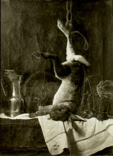 Lapin suspendu par une patte de derrière au-dessus d'une table, la tête reposant sur une serviette dépliée. A droite, ustensiles de chasse. A gauche, un pot d'étain, un vase de verre et un panier de pommes