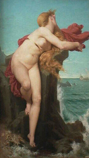 scène mythologique (Ariane : nu, rocher, tristesse, Naxos) ; fond de paysage (bateau à voiles, mer)
