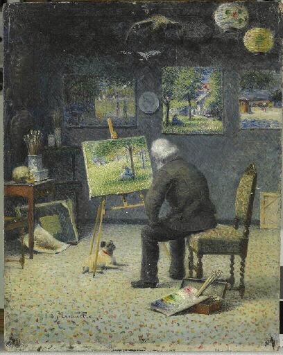 portrait ; paysage (atelier d'artiste, peintre, homme, assis, de dos, chevalet)