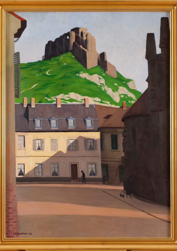 Huile sur toile. ; Représentation de la forteresse de Château-Gaillard aux Andelys vue en contrebas, depuis la petite rue qui entoure l'église Saint-Sauveur.Maison au badigeon jaune au centre, deux piétons dont l'un avec un chien. Ce tableau peut a priori ressembler à un paysage exact des Andelys. Il s’agit en réalité d’un paysage dit « recomposé », terme employé par Félix Vallotton pour qualifier les paysages qu’il peint à partir de 1901-1902 à Locquirec, en Bretagne, et à Honfleur, et dont il a fait sa spécialité. A partir de 1909, Vallotton et sa famille passent leurs étés à la villa « Beaulieu », à Honfleur. Malgré les nombreux amis de passage et la tension familiale, le peintre profite d’un vaste atelier aménagé dans une ancienne grange. C’est là qu’il élabore définitivement et radicalement sa conception synthétique du paysage. Il écrit : « Je rêve d’une peinture dégagée de tout respect littéral de la nature, je voudrais reconstituer des paysages sur le seul secours de l’émotion qu’ils m’ont causée, quelques grandes lignes évocatrices, un ou deux détails choisis, sans superstition d’exactitude d’heure ou d’éclairage ». Il travaillera, jusqu’à la fin de sa vie, à ce rêve. L’objectif principal est de traquer la permanence de la nature, de l’être, de l’observé dans le cadre rigoureux de la forme et du trait. Le fugitif lui est insupportable. Il prend donc de la distance par rapport à la réalité, supprime les détails superflus, au profit des grandes formes, des contours précis et de l’immobile, stylise et repousse l’anecdotique, à la recherche du calme, de la sérénité, de l’ordre et de l’équilibre qu’il admirait chez Holbein ou Ingres . Pour les ombres et les lumières, sans doute influencé par son travail de xylogravure, il travaille sur des contrastes violents et une délimitation nette des plages. A partir d'émotions ressenties sur place, Félix Vallotton médite un paysage, l'élabore à partir d'une documentation et de croquis réalisés sur place. Si on compare le tableau avec la réalité et avec le croquis préparatoire élaboré pour cette œuvre, on comprend comment le peintre a procédé : il conserve chaque élément avec ses caractéristiques mais les comprime pour remplir le champ défini. Ici, la monumentalité du château, en réalité petit et éloigné, est ainsi accentuée. Il observe exactement la réalité qu’il transforme déjà dans l’esquisse. Ses croquis, détaillés, annotés d’un code chiffré pour les couleurs, sur de minuscules carnets achetés pour un sou. Tout y est posé : délimitations, zones d’ombres et de lumière. Dans le calme de son atelier, à l’abri du motif, il transcrit ensuite en couleurs. Celles-ci, appliquées finement, lisses mais couvrantes, sans dégradé, sont traitées d’une manière très particulière. Aucune illusion de perspective aérienne : les couleurs sont aussi intenses à l’arrière-plan qu’au premier. Par leur traitement, elles accentuent les contours simplificateurs et sont choisies librement ; cette liberté par rapport aux couleurs naturelles est directement héritée des Nabis tout comme les aplats et la stylisation des volumes. Par sa technique, il modifie totalement les effets de perspective, de cadrage et de composition. Le choix iconographique, entre plissement géologique et édifice médiéval, vient renforcer le souci de permanence et d’universalité exprimé par Félix Vallotton, au rebours du fugace de l’Impressionnisme. Cette œuvre de maturité, caractérisée par son rendu irréel, est très représentative du paysage « recomposé » de Vallotton et constitue une synthèse des expériences passées. Le peintre y exprime une vision intérieure et personnelle de la réalité dont le traitement abstrait contribue à la modernité.