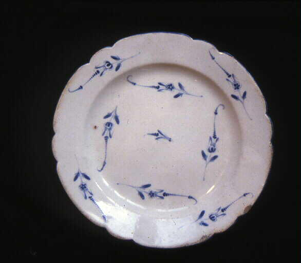 Assiette plate à bords contournés, bordée d'un liseré bleu en faïence demi-fine. Décor en camaïeu bleu de brindilles formant un carré. Reprise des brindilles sur l'aile de l'assiette
