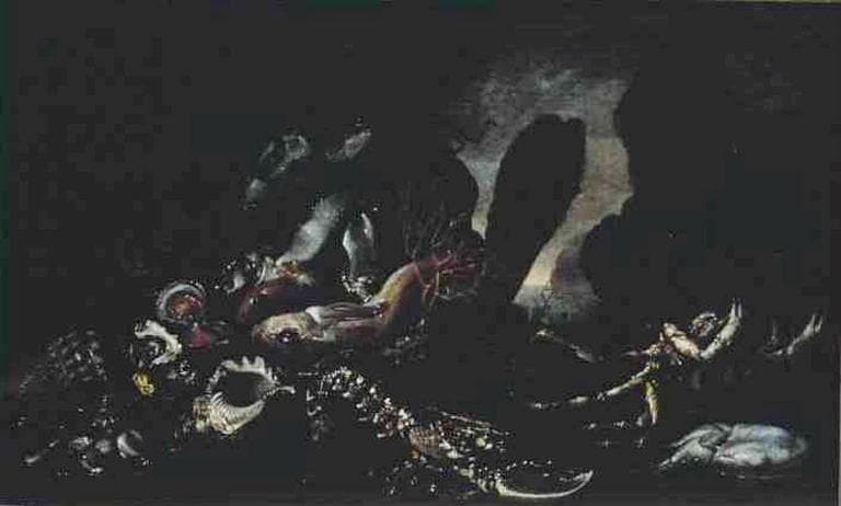 'Attribuée à Giuseppe Recco, cette nature morte de 'poissons et crustacés' située dans un environnement maritime, n'est pas sans parenté avec la nature morte du Musée de Besançon signée de Giovanni Battista Recco. Les proportions de notre peinture, tout en largeur, sont radicalement différentes de celle du tableau de Besançon, composé en hauteur. Cependant, la construction pyramidale, l'adoption de lignes obliques dont l'angle sur l'horizontale est le même dans l'un comme l'autre tableau, le rendu sensuel des matières, l'identité de certains détails, comme la nasse placée sur la gauche dans les deux oeuvres, pourraient faire pencher pour une attribution à Giovanni Battista Recco dont le souvenir avait été longtemps occulté par les succès de son neveu Guiseppe.' (P. Bazin. Objets de plaisirs)