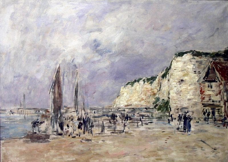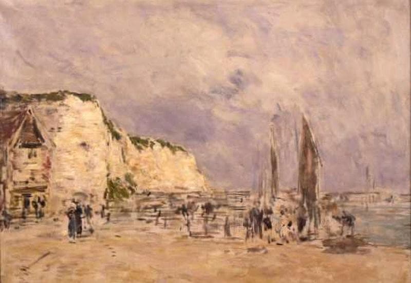 Cette très belle 'esquisse' datée au dos de 1896 révèle toutes les qualités d'observation 'sur le motif' dont le peintre savait faire preuve. Il est intéressant de confronter ce tableau avec ceux de Pissaro et d'Eva Gonzalès [présents dans les collections du Musée], c'est bien là la même falaise du Pollet, elle joue un rôle important dans ces deux autres oeuvres, mais on la trouve ici vue en plan rapproché. La maison du 'Petit Paris' (démolie en 1911), la falaise, le ciel, les mâts et les voiles de quelques embarcations, les personnages en mouvement servent de prétexte à la subtilité des accords de gris, de bruns légers, d'ocre clair et de vert. Comme souvent chez Eugène Boudin, les rapports de tons en 'mode mineur' reconstituent l'atmosphère du lieu sans préoccupation de réalisme documentaire.