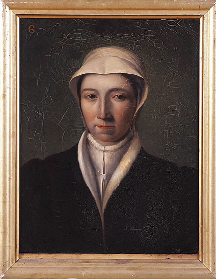 numéro, En haut à gauche : Numéro peint en chiffres dorés, en haut sur notre gauche, Numéro Château d’Eu 1836 : 6, 6 ; légende, Au dos : , Isabelle de France, Reine d'Angle-/-terre seconde fille de Philippe IV,/dit le Bel Roi de France & de Na-/-varre : née en 1292 : mariée le 22/Janvier 1308 à Edouard II Roi/d'Angleterre : morte à Roseing, le/31 Novembre 1357.
