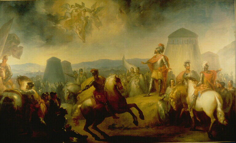 scène historique (Alphonse Ier de Portugal, cavalier, Christ, tente, prise de place : Ourique)